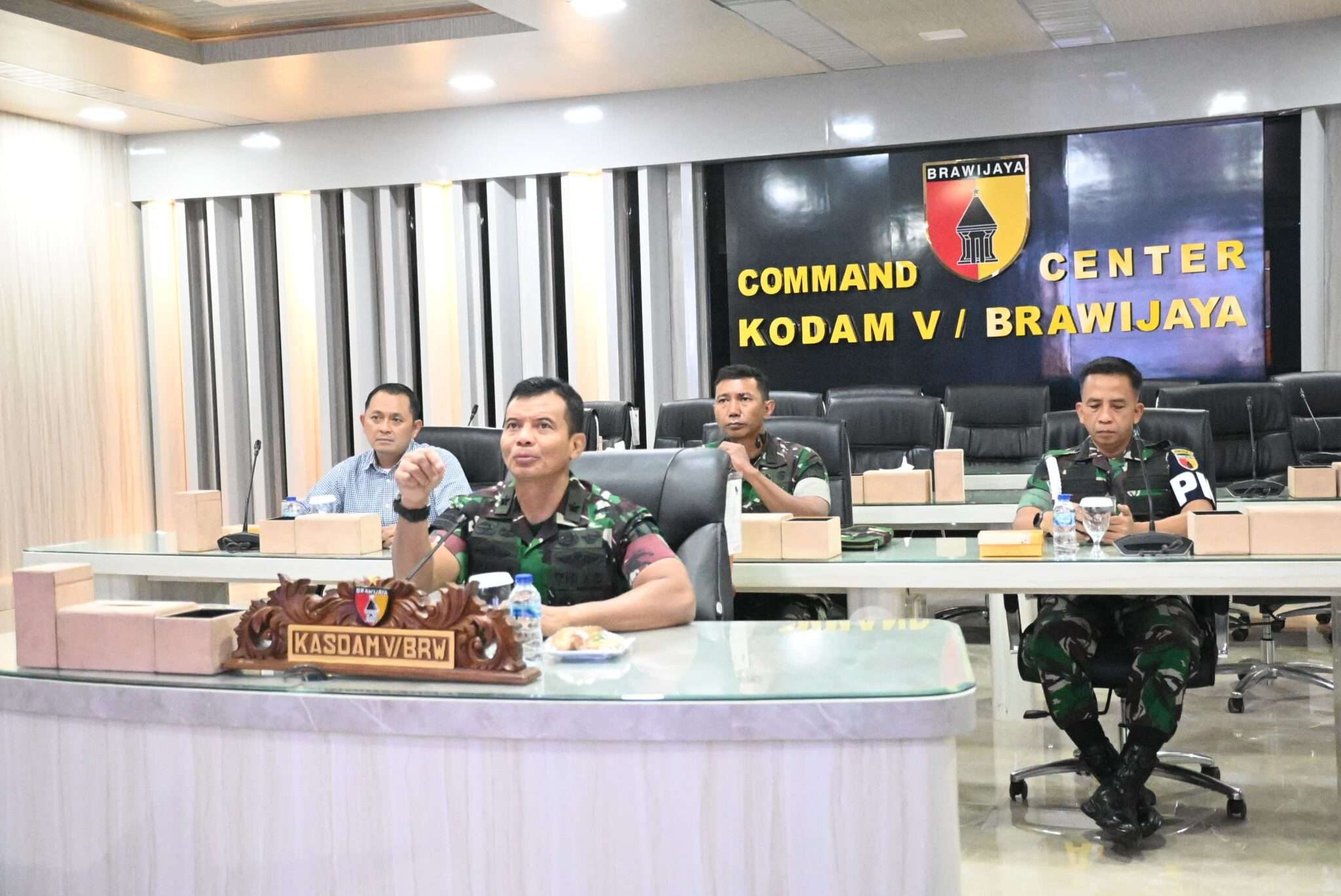 SURABAYA, – Kasdam V/Brawijaya Brigjen TNI Zainul Bahar, S.H., M.Si mengikuti Rapat Lanjutan Evaluasi Percepatan Pembangunan Kawasan Desa Kreatif Mandiri Produktif (KDKMP) secara daring melalui Zoom Meeting yang digelar di Ruang Smart Integrated Command Center (SICC) Makodam V/Brawijaya, Selasa (23/12/2025).