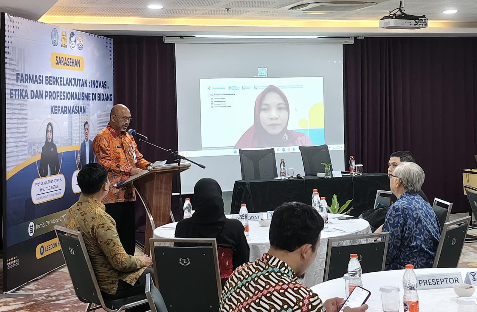 Turut menjadi narasumber utama dalam sarasehan ini, Prof. Dr. apt. Dyah Aryani Perwitasari, M.Si., Ph.D., FISQua., selaku Ketua Kolegium Farmasi Indonesia, yang hadir secara daring melalui Zoom Meeting. Beliau membawakan materi tentang “Kurikulum Bundling Program Studi S1 Farmasi dan Program Studi Pendidikan Profesi Apoteker.”